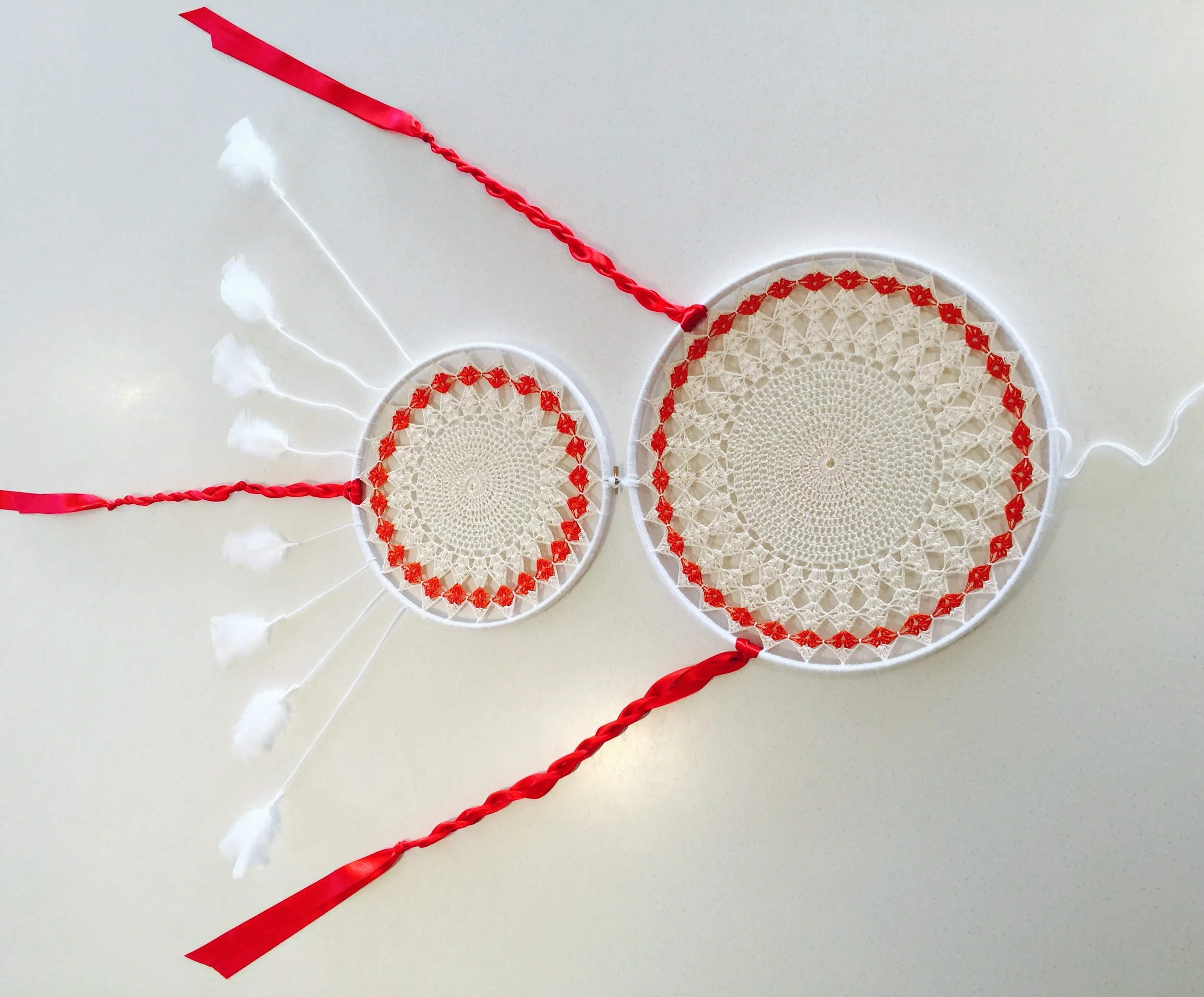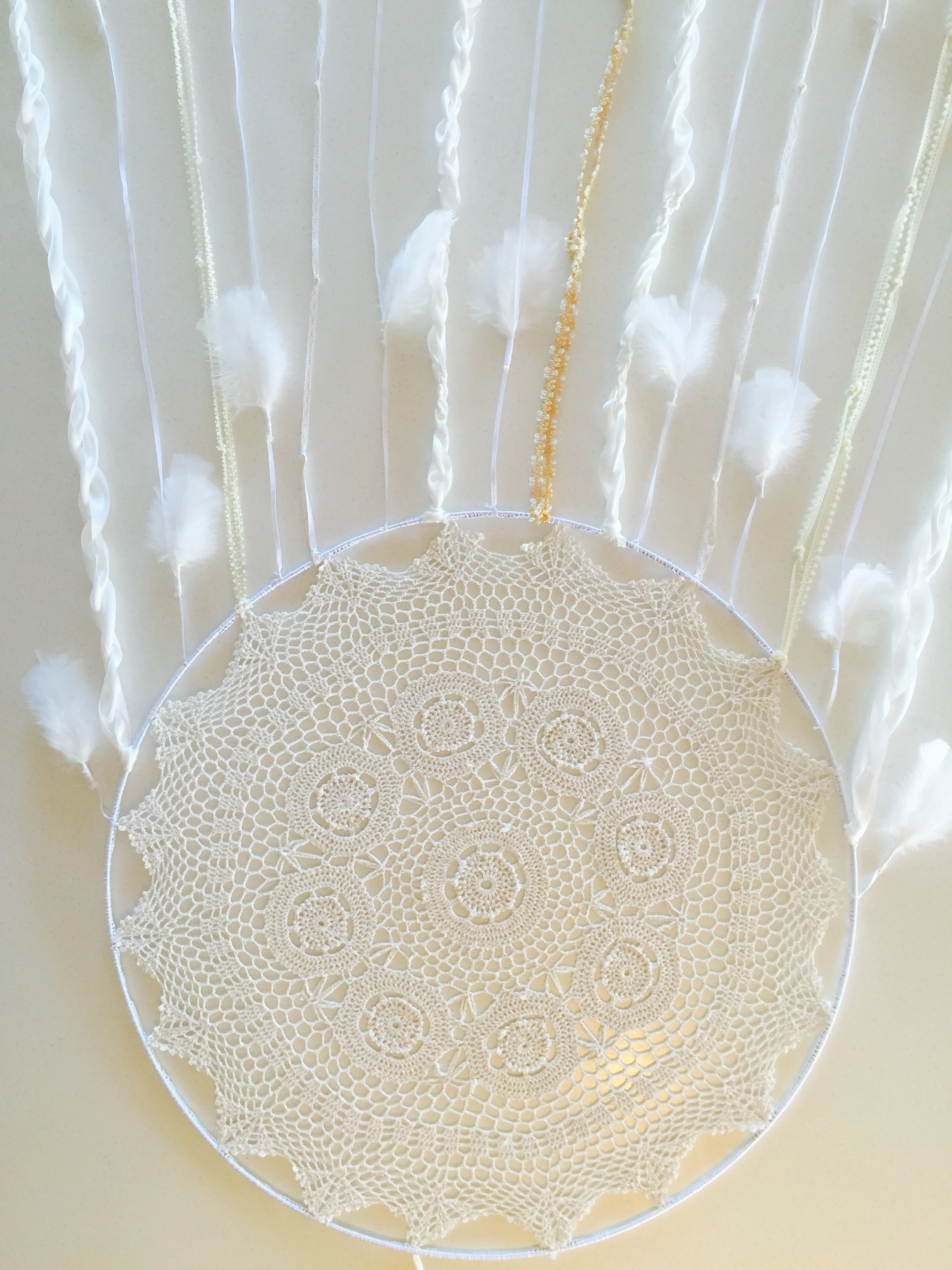 Every dreamer is unique with their coloured threads, Lace, Ribbon, Willow, wood, hand spun wool, feathers & beads. The materials are new, recycled & gathered. Thus being the case it is recommended to place them in a dry sheltered space. Indoors is ideal & if placed in a space with direct sunlight for long periods of time their colour may fade.